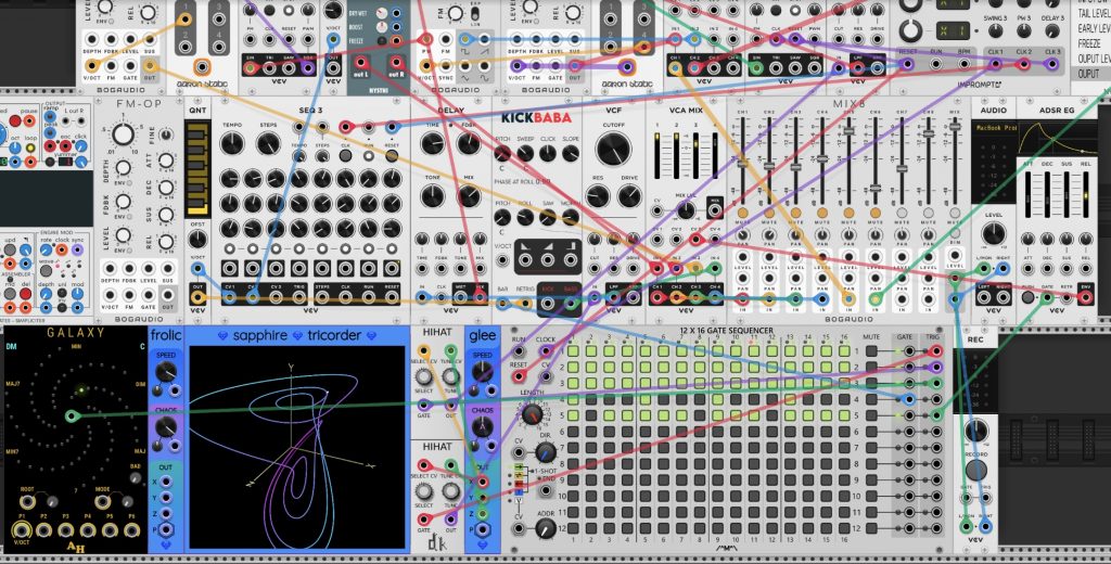 Inside VCV Rack, I created a percussive chain using Glee, KickBaba, and Hihat modules. The trigger logic was built using a 12×16 Gate Sequencer, where I manually routed gate signals into asymmetric paths. To break repetition, I patched chaos CV sources into the sequencer’s gate length and division inputs, so the rhythm would shift, collapse, or overlap unpredictably.